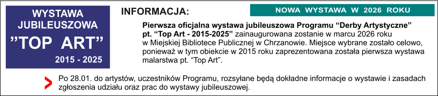 EDYCJA  JUBILEUSZOWA www.derby.arte.info.pl PROJEKT  “INTEGRACJA  SZTUKI” 2014 - 2026 Strona informacyjna Programu w trakcie modyfikacji i realizacji zmian fot. grafika ilustracyjna - przykładowe obrazy z wystawy “Surrealizm i Realizm Magiczny” jaka realizowana była w ramach Programu “Derby Artystyczne”. Informacja: Do czasu zakończenia prac związanych ze zmianami na stronie informacyjnej Programu - dostępne są tylko podstawowe informacje. Biuro Programu “Derby Artystyczne” - 2.01.2026 r. W dniu 3.10.2025 r. o godz. 18.00 w Miejskiej Bibliotece Publicznej w Chrzanowie odbyła się oficjalna inauguracja Projektu Artystycznego ”John Lennon i inni...”, przy komplecie publiczności i z koncertem towarzyszącym pt. “Powrót do przeszłości”. INFORMACJA: WYSTAWA ”PIERWSZY  KROK” przedpremierowa wystawa malarstwa - prezentacja przykładowych obrazów z Projektu “John Lennon i inni...” oraz prezentacja nagrodzonych prac z wystawy “Beatlesi - inne spojrzenie”. Inauguracja Projektu ”John Lennon i inni...” Kawiarenka Artystyczna i koncert towarzyszący pt. “Powrót do przeszłości”, zainaugurowały realizację programu Projektu “John Lennon i inni...”. Odbyło się też wręczenie nagród i wyróżnień dla laureatów wystawy malarstwa młodzieży pt. “Beatlesi - inne spojrzenie”. (C) Derby Artystyczne  |  2024 - 2026 W czerwcu 2025 r. zainaugurowana została w Chrzanowie ogólnopolska wystawa malarstwa młodzieży szkół średnich pt. ”Beatlesi-inne spojrzenie”- Prolog pierwsza tego typu wystawa w Polsce, zrealizowana w ramach Projektu Artystycznego “John Lennon i inni...”.      Inauguracja wystawy wraz z koncertem, odbyła się 6.06.2025 r., w obiekcie Miejskiej Biblioteki Publicznej w Chrzanowie. Wystawa prezentowana była do dnia 30.08.2025 r., a obejrzało ją około 2400 osób.  Na wystawie zaprezentowano 70 prac autorskich.    WYSTAWY i wydarzenia w ramach Projektu Artystycznego “John Lennon i inni...” Informujemy.... W dniu 3.10.2025 r. również w Chrzanowie odbyła się oficjalna inauguracja Programu Projektu “John Lennon i inni...”. W tym dniu w obiekcie Miejskiej Biblioteki Publicznej w Chrzanowie obyło się otwarcie wystawy malarstwa ”Pierwszy Krok” z przedpremierowym pokazem kilkunastu przykładowych prac z głównej wystawy Projektu, poświęconych J. Lennonowi i grupie The Beatles. Dodatkowo pokazana została wystawa nagrodzonych i wyróżnionych prac z wystawy “Beatlesi - inne spojrzenie”.   Obie wystawy prezentowane były do dnia 31.12.2025 r. Rok 2025, był głównie okresem prac nad przygotowywaniem imprez jubileuszowych Programu “Derby Artystyczne”. Głównym wydarzeniem jubileuszowym będzie przygoto- wywany Projekt Artystyczny  p.n. “John Lennon i inni...”. Informacja-oprac: - 01.2026 r. W październiku i listopadzie realizowane były prace nad dwoma teledyskami muzycz- nymi do Projektu “John Lenjon i inni..” z udziałem młodych artystów. Aktualnie prace są na ukończeniu, premiera zaplanowana jest w styczniu 2026 r.        W tym roku planowna jest też przełożona premiera filmu dokumentalnego ”Literacka twórczość Johna Lennona”, zrealizowanego w ramach Projektu. Informacje podawane będąna stronie www i w materiałach informacyjnych. O kolejnych pracach Projektu, będziemy informować. Projekt Artystyczny p.n. ”John Lennon i inni...” KOMUNIKAT: W związku z aktualnymi pacami dotyczacymi zmiany serwera www  - strona informacyjna Programu czasowo dostępna będzie pod uruchomionym dodatkowym adresem: Część linków może być nieaktywna. Po zakończeniu prac - strona powróci pod poprzedni adres.